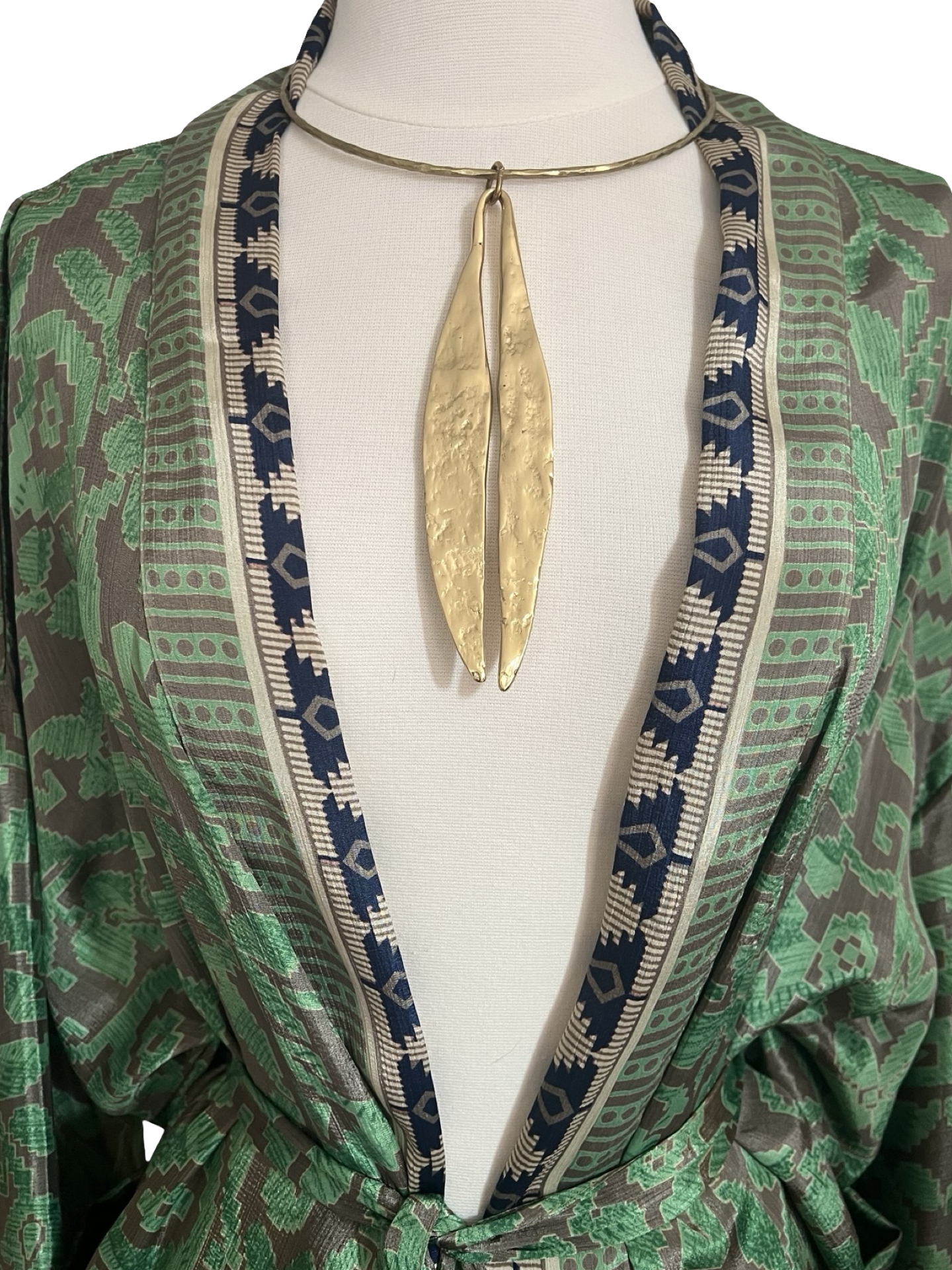 Gorgeous, large brass sculptural pendant sits perfectly with its open brass collar.