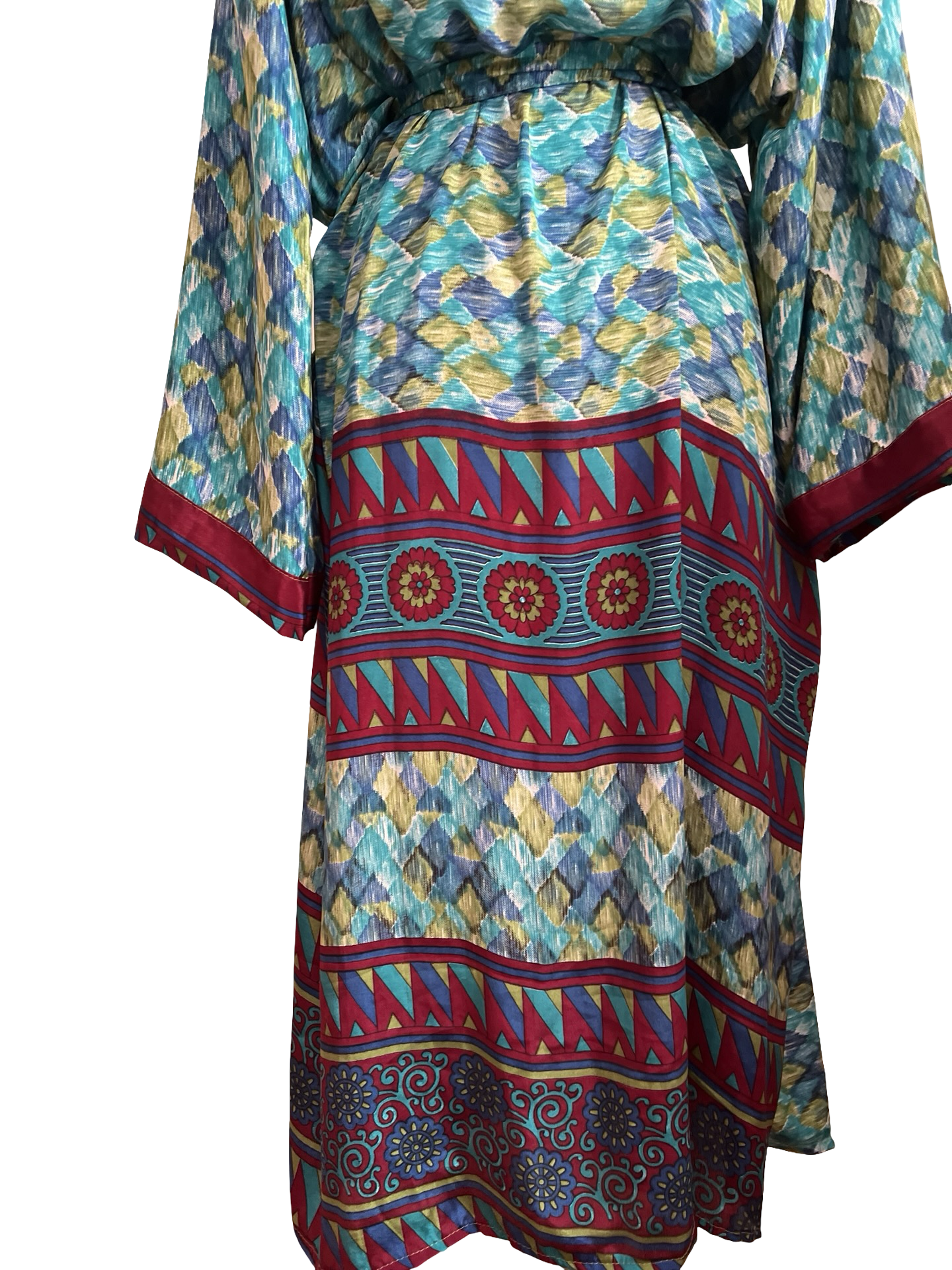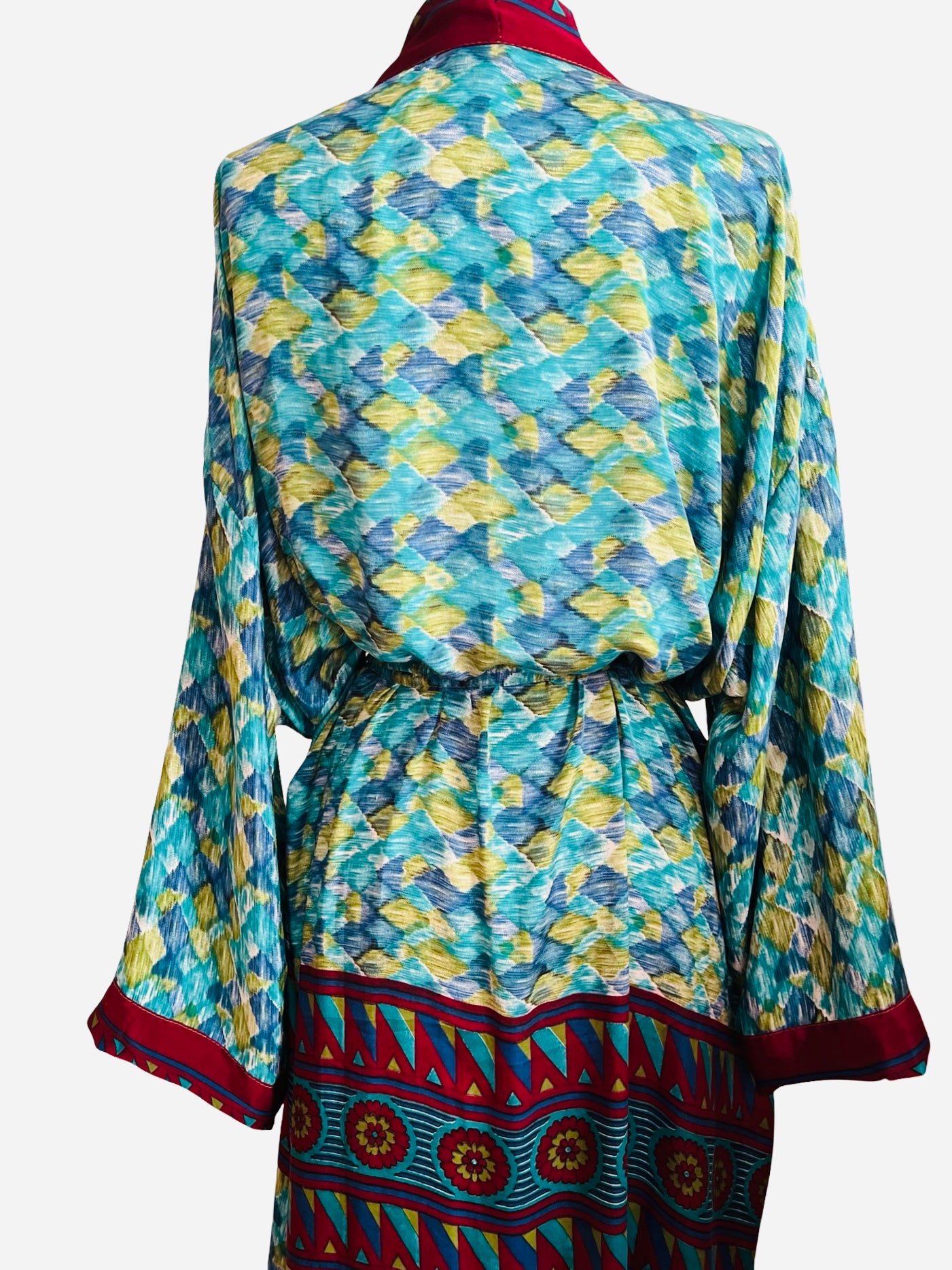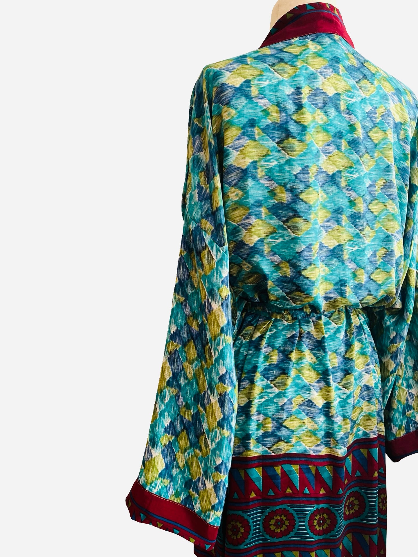 Gorgeous, glamorous Vintage recycled silk from India. Repurposed into modern Kimono inspired Loungewear.