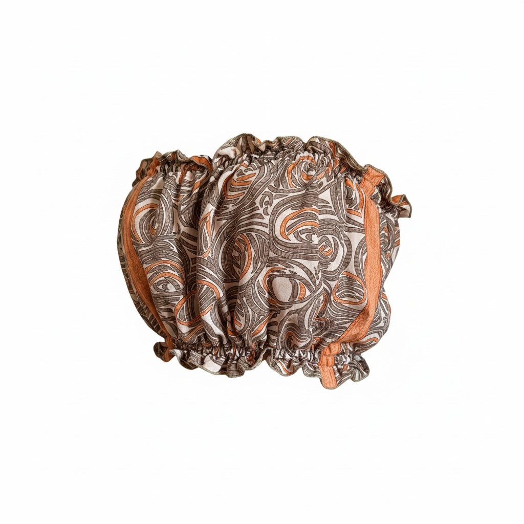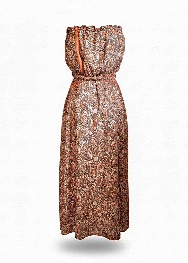 Bandeaux top has elastic top and bottom. The top is reversible with a different pattern in same silk. Top fits size 0-14 chest size AA to DD